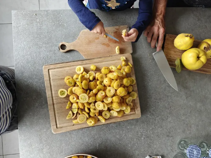 Schil de kweeperen, verwijder klokhuizen en snijd ze in kleine stukjes. Voeg de stukjes Japanse kwee toe (met schil, zonder pitten).